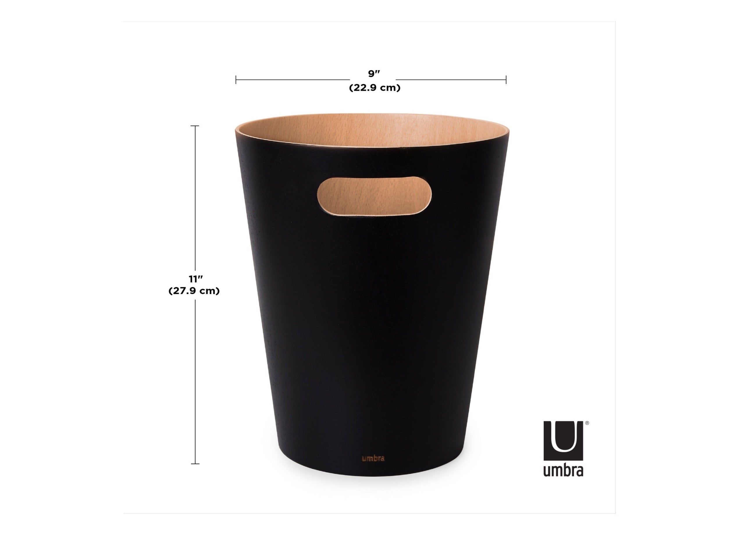 Design Elements Tapered, cylindrical shape, horizontal oval handle cutout, clean minimalist lines, small Umbra logo
