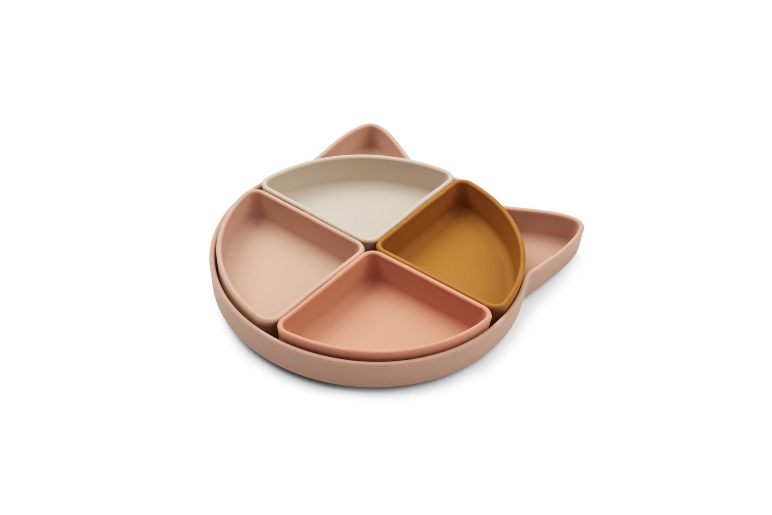 The plate features a soft blush pink cat silhouette as its primary color, with four distinct compartments in complementary colors: light pink, cream (beige), and mustard yellow. The color – coded compartments not only add visual appeal but also help children easily identify different foods. The cat – shaped design comes with raised ears, subtle facial details like whiskers and a nose, and rounded edges for the safety of little ones.