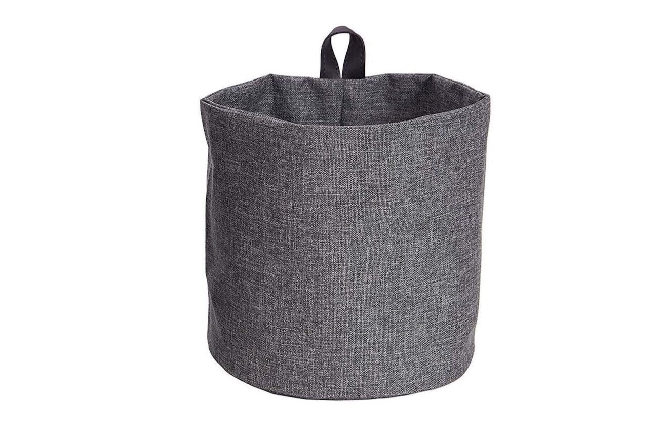 - Handle: Single black fabric handle attached to the top rim