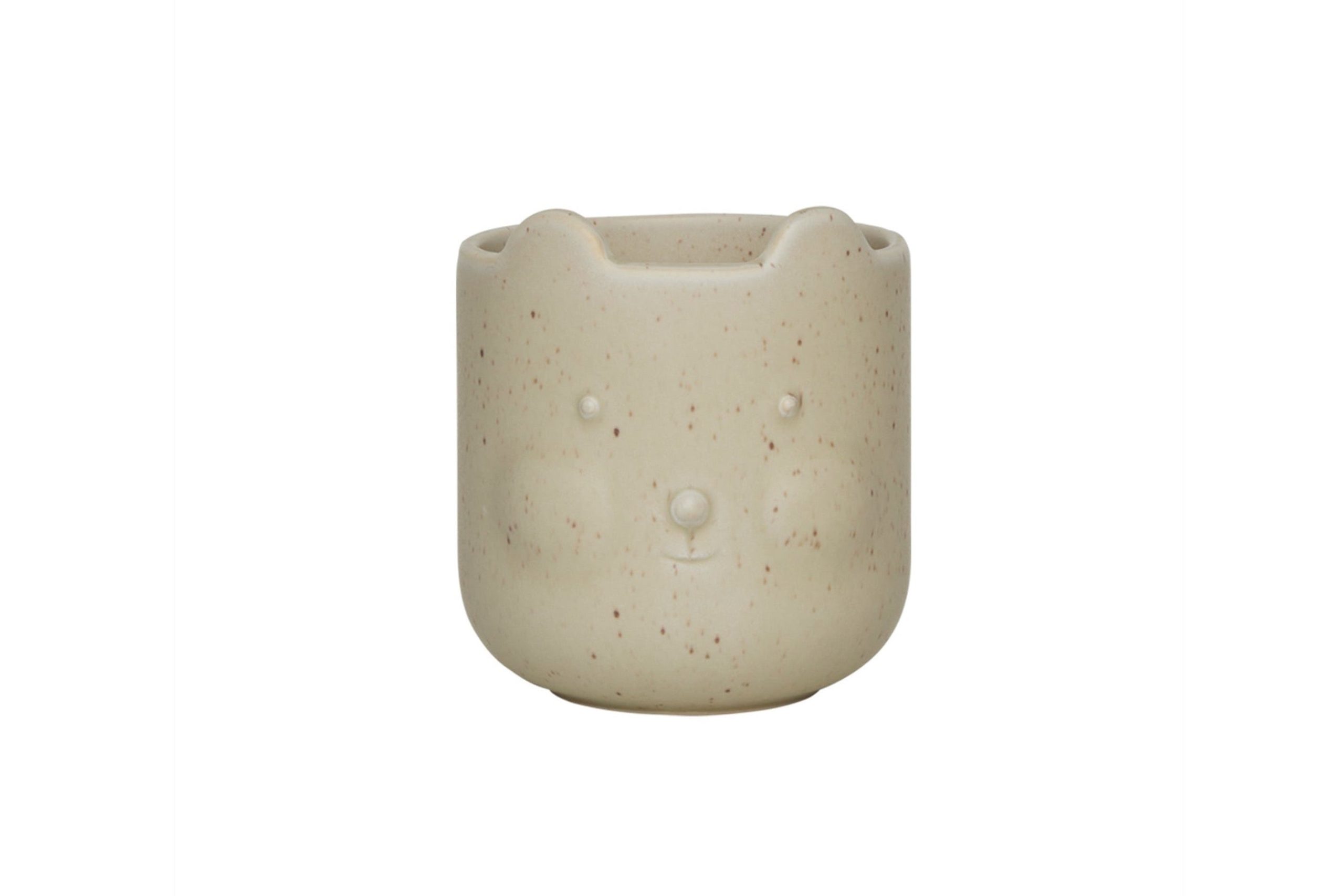 The primary color of the Bärentopf is a light, off – white/cream base, adorned with a speckled pattern of tiny brown dots. Its design features an adorable animal face, resembling a bear or cat, complete with two small circular “eyes” (either raised or indented), a single small circular “nose”, a subtle curved “mouth” (in a smile), and two small ear – like indentations/raises at the top, which form the top edge of the holder. The shape is a short, rounded cylinder with a slightly wider base that tapers gently upward.