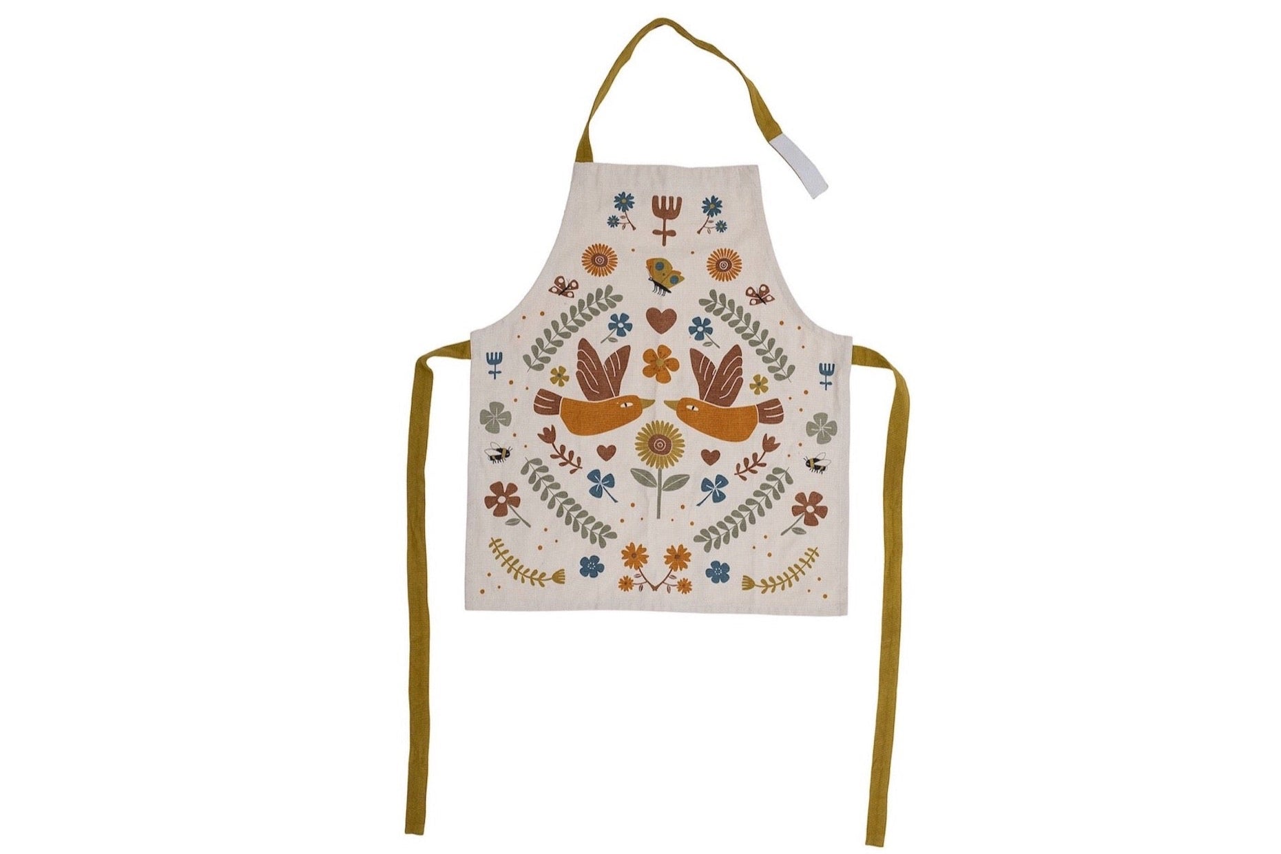 The apron features a cream/off – white base color with a canvas – like texture. Its folk – inspired, whimsical pattern is the highlight, with two brownish – orange birds facing each other as the central focal point. Alongside, you’ll find an array of floral details including blue flowers, orange/yellow sunflowers, and small red/brown blooms. Green leafy branches, bees, butterflies, hearts, and tiny symbolic shapes add to the charm. The mustard yellow straps, along with earthy accents of browns, oranges, blues, and reds, give it a warm, vintage folk – art vibe.