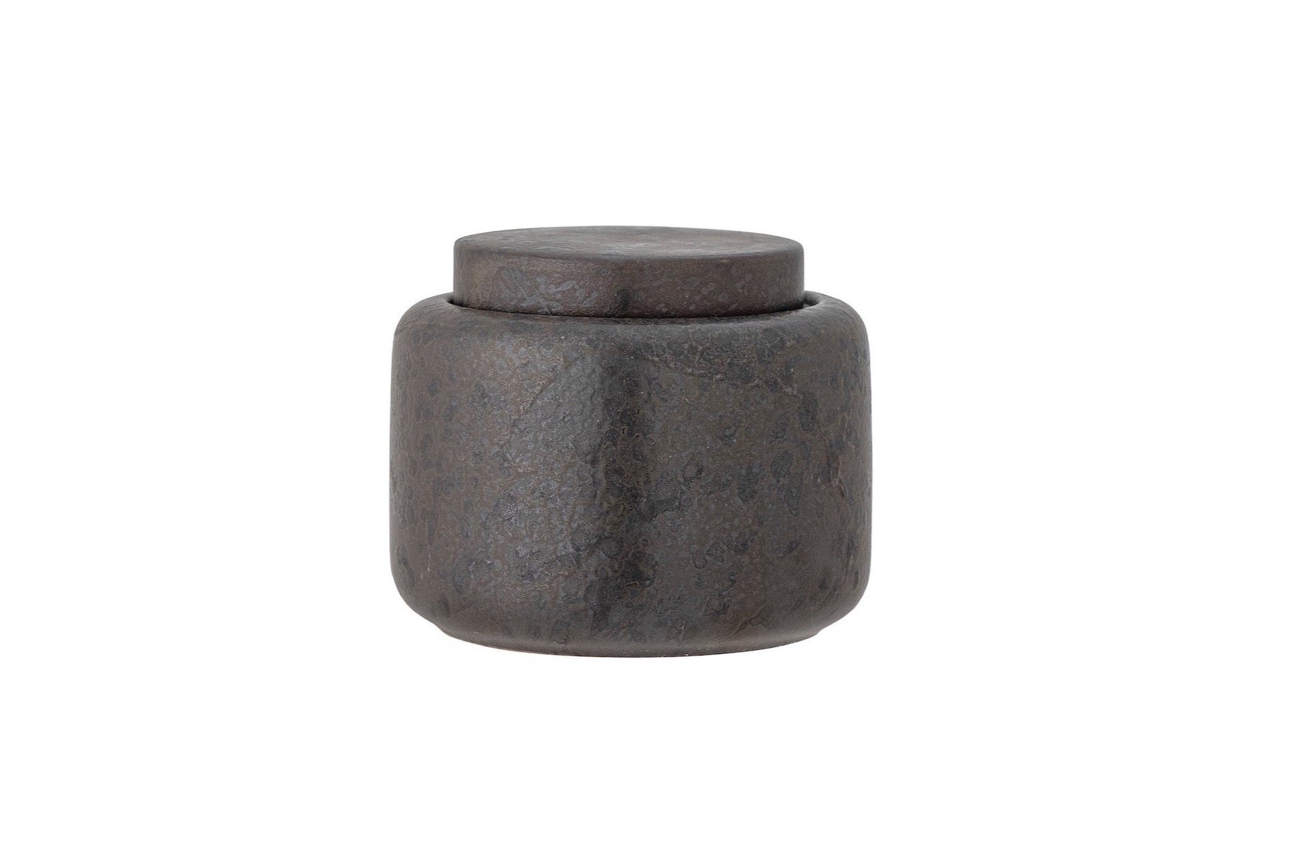 The container features dark, earthy tones, predominantly a matte black or dark brown with subtle variations, adding to its organic charm. Its minimalist, cylindrical shape with a flat top and a simple, rounded lid creates a sleek and cohesive look, as the lid’s texture and color match the jar precisely.