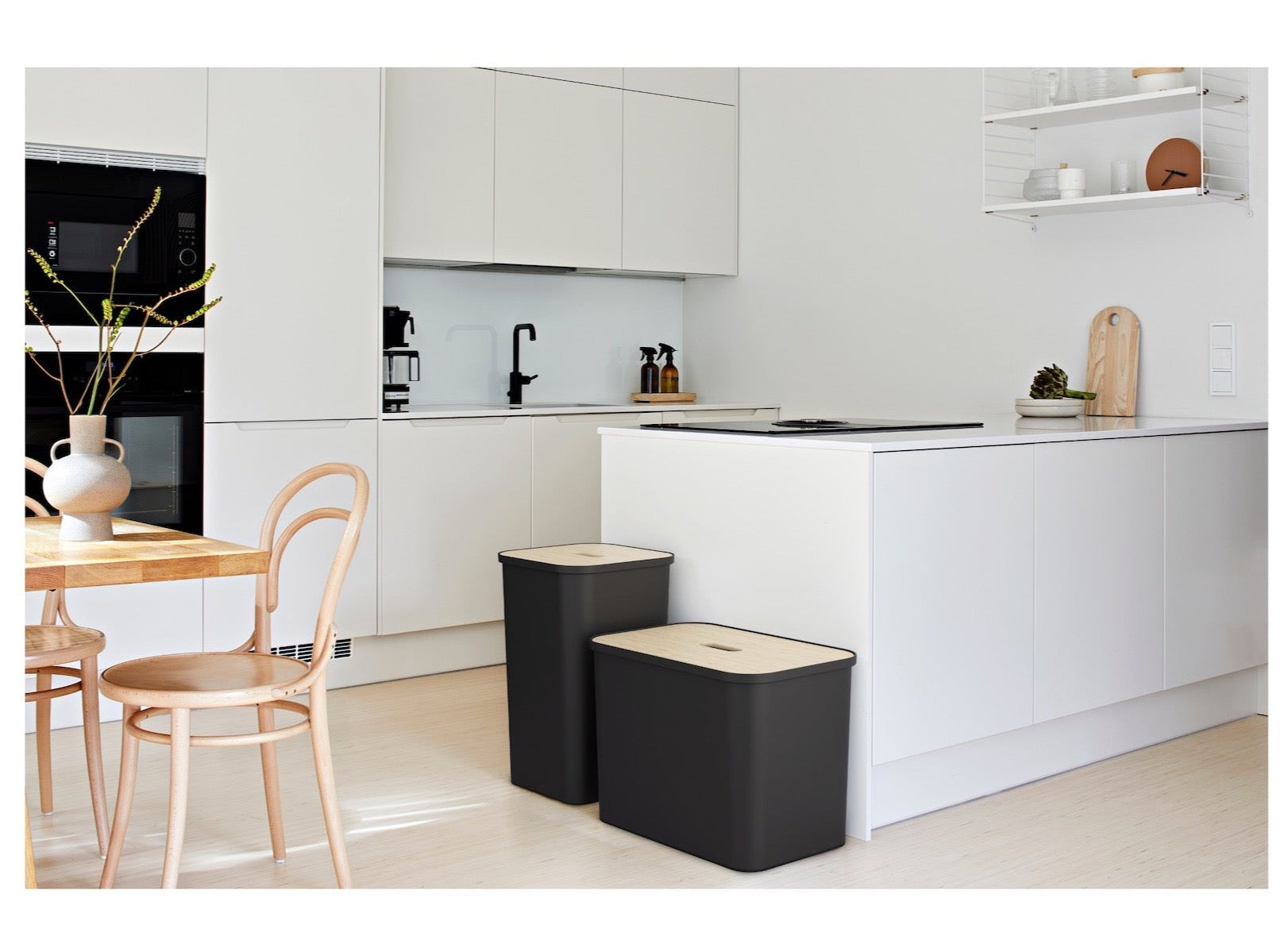 The main body of the bin is crafted from high – density polyethylene (HDPE), a sturdy and durable plastic with a smooth, matte black finish. This not only gives it a modern look but also makes it resistant to stains and dents. The lids, as seen in the kitchen image, have a light wood or wood – composite top with a natural finish and a black plastic rim/body, adding a warm and natural touch to the overall design. In the bathroom, a white, fine – mesh netting (likely nylon or polyester) is provided to hold trash bags securely.