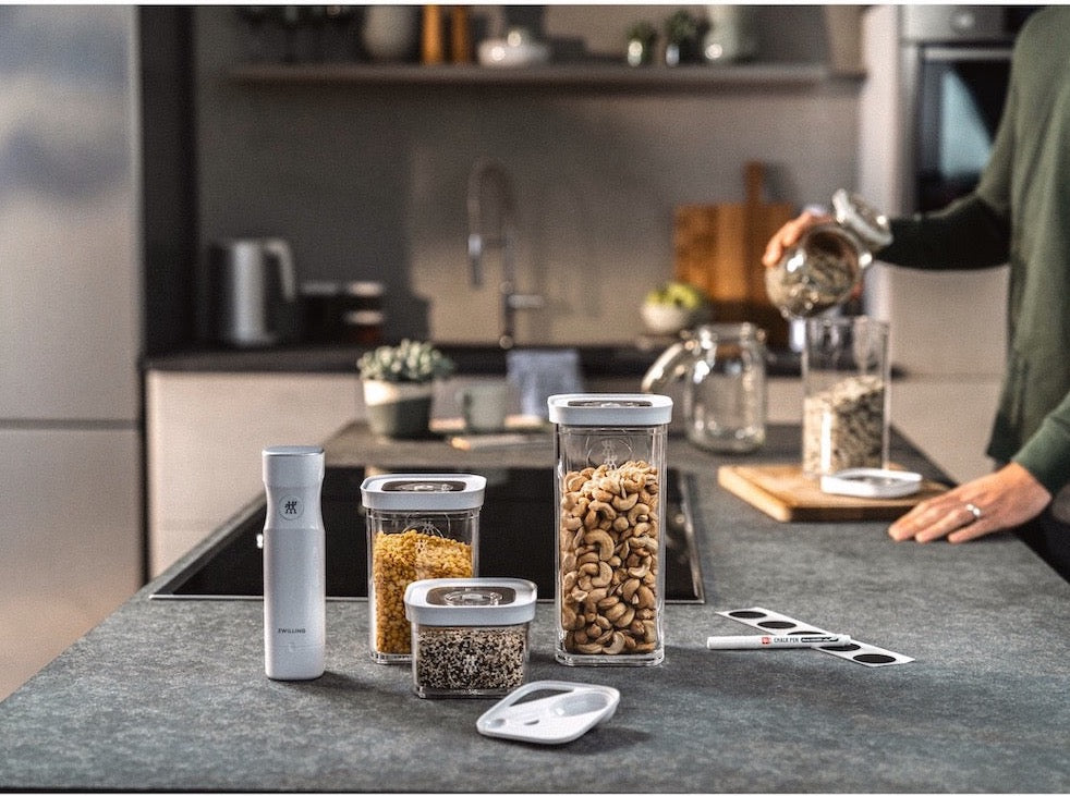The set also comes with useful accessories. There are black circular silicone/rubber seals, which are likely replaceable with extra pieces included for long – term use. A white plastic pen with a sleek “ZWILLING” logo is provided for labeling containers, and a small white plastic tool serves as a measuring scoop for portioning or a lid rest to keep lids clean when opening containers.