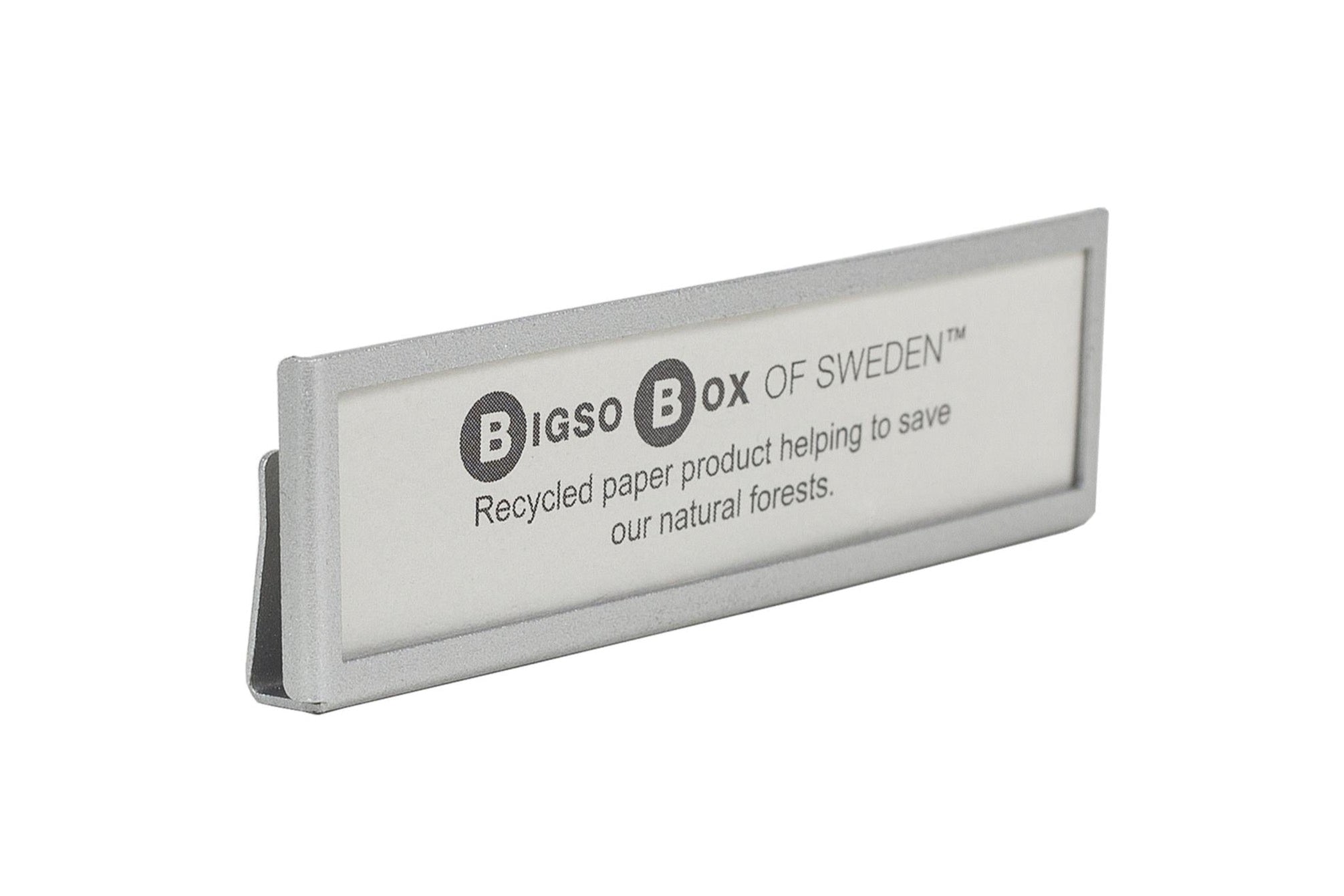 | Label Material | White recycled paper with metallic (aluminum or plastic) rectangular frame |