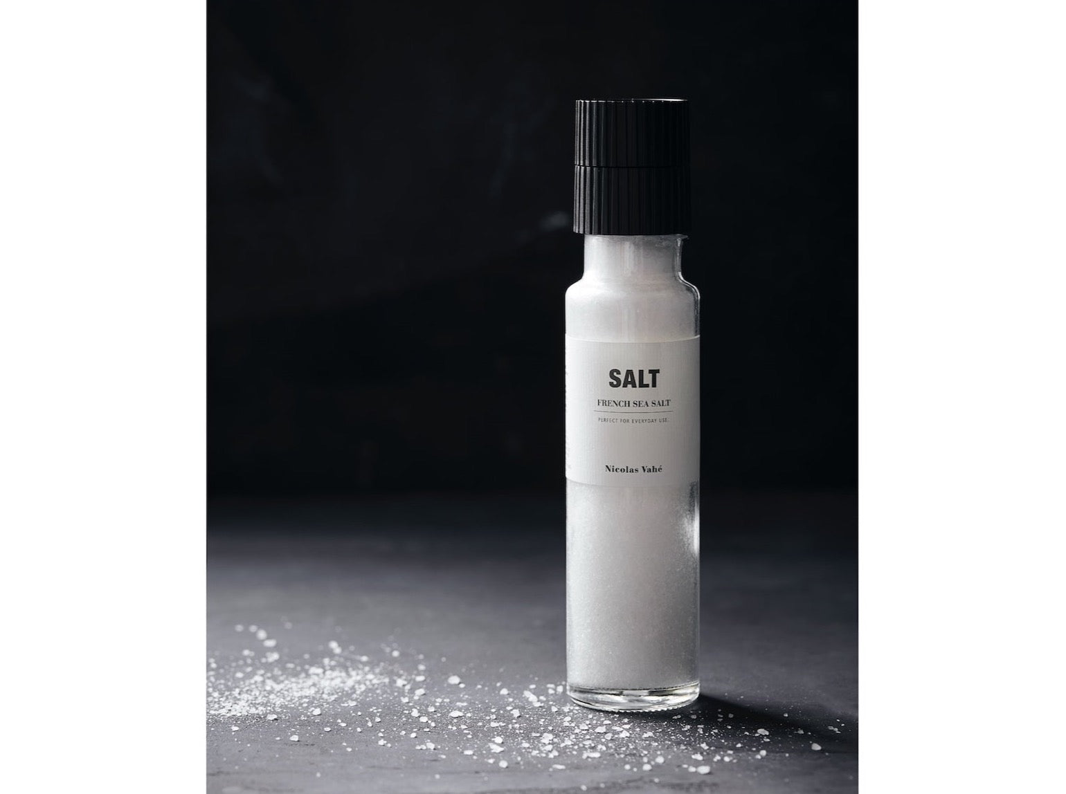 | Design Elements | Minimalist, modern with bold “SALT” text, secondary text “FRENCH SEA SALT” and “Perfect for everyday use”, brand name “Nicolas Vahé” at the bottom, no patterns |