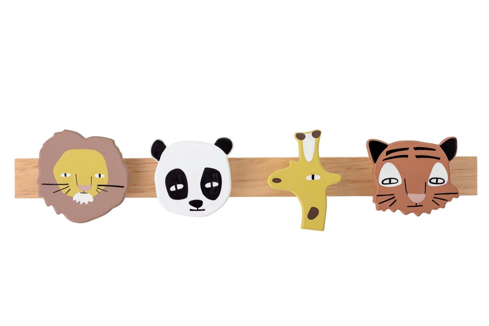 - Design: Features simplified, cartoonish animal heads (lion, panda, giraffe, tiger) with functional hooks and an evenly spaced layout.