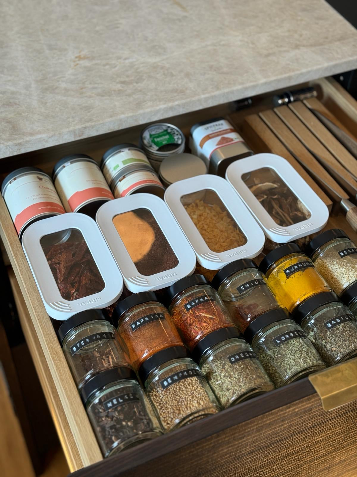 Complementing the glass jars are white plastic organizers. These hard and durable organizers have rectangular transparent windows, allowing for quick identification of the stored spices or other small items. The organizers are also labeled with text like “MKBAL”, indicating their branding. The compartments in the organizers are small, around 3 – 4 inches tall and 2 – 3 inches wide, and a set of 4 – 5 organizers can fit into a typical kitchen drawer. The overall drawer, which has a natural – finished wooden interior, has common spice – storage system dimensions, being about 18 – 24 inches wide and 1 – 2 feet deep. It is equipped with a brass/gold – toned metal drawer pull, adding both durability and an aesthetic touch.