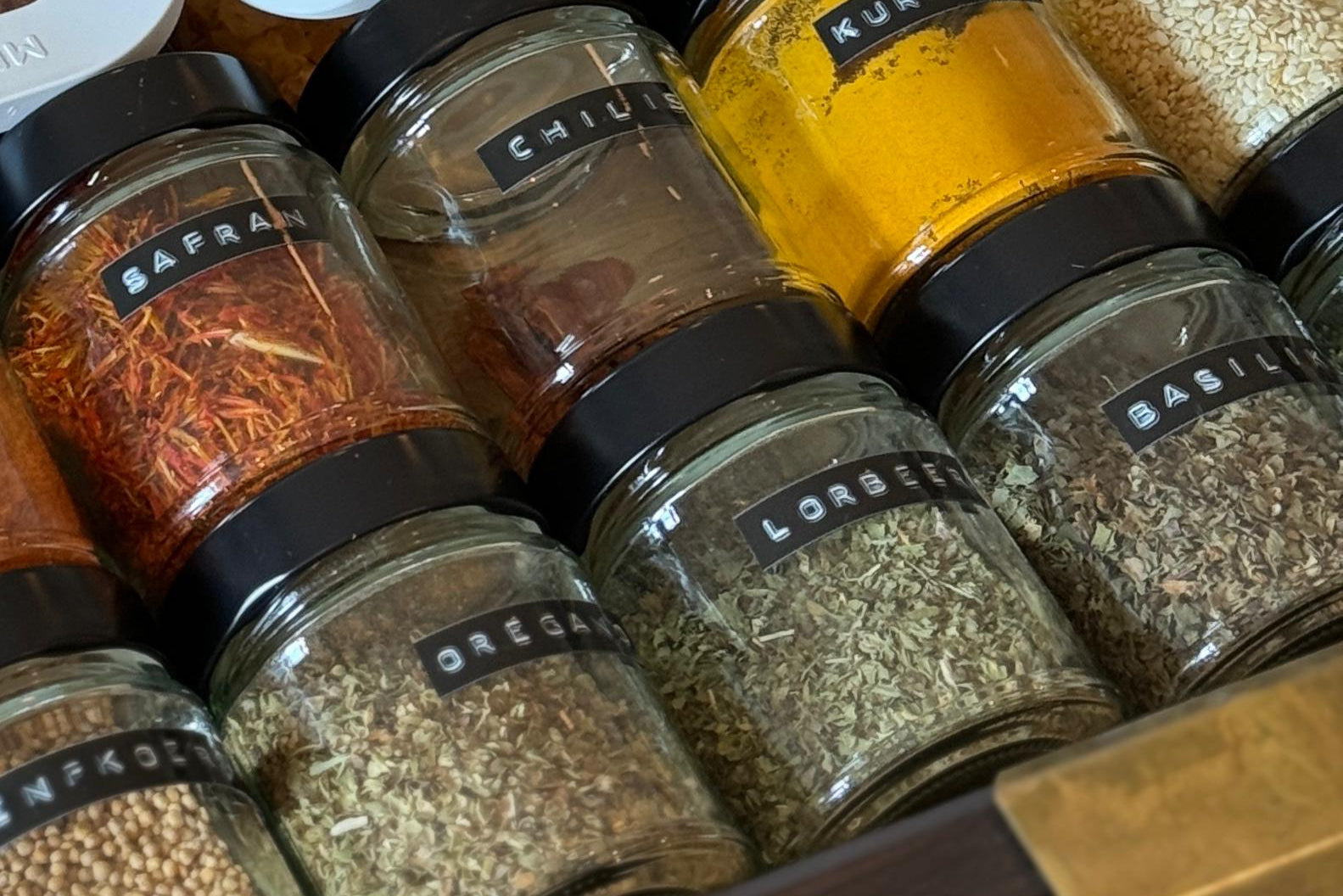 The core of the system consists of clear glass jars. The jars are made of thick, smooth – edged glass, ensuring durability. They come with black lids, likely made of plastic or rubberized material, which provide a good grip and offer an airtight seal to protect your spices from moisture and dust. Each jar has a bold black label with white text, such as “SAFRAN,” “CHILI,” “BASIL”, making it easy to quickly identify the spices inside. The jars are of a standard spice jar size, approximately 3 – 4 inches tall with a diameter of about 2 – 3 inches, and they fit perfectly within the standard drawer depth.