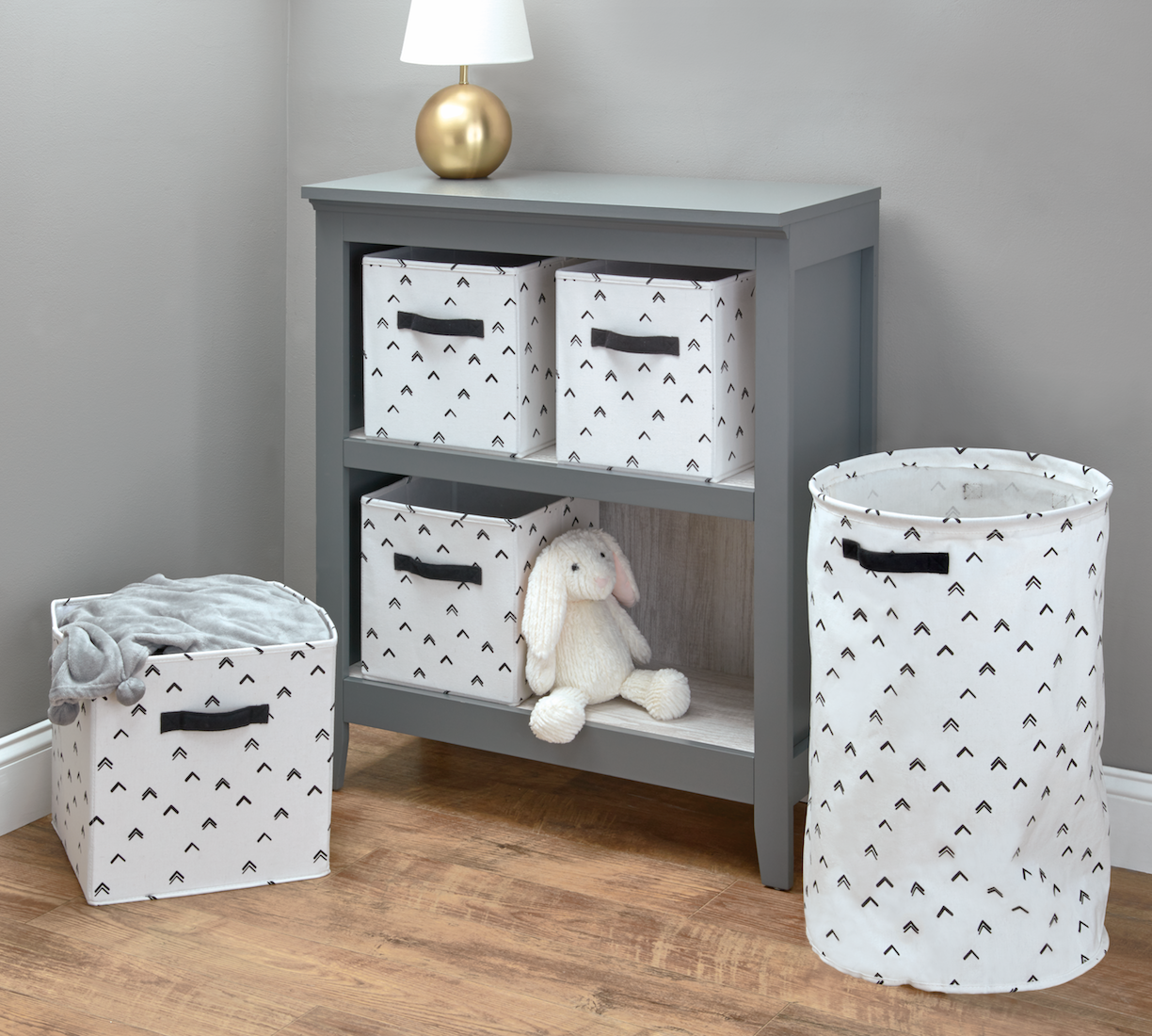 Introducing the Kinderzimmertonne Arrow, a versatile and stylish storage solution for your home. This product is part of a coordinated storage system that includes both a cylindrical fabric storage bin/laundry hamper and square storage boxes, all featuring a modern, minimalist geometric design.
