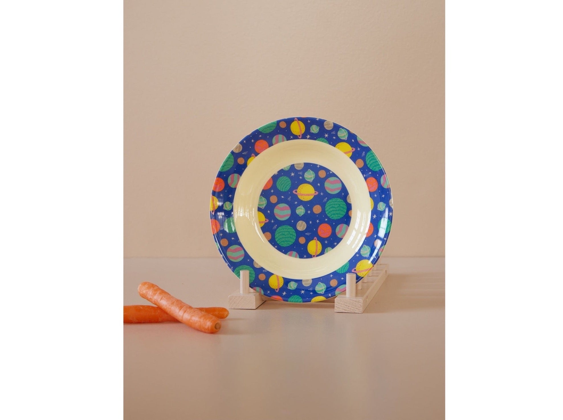 In terms of quality, the plate is meticulously produced with seamless edges, a uniform printed pattern, and no visible cracks or blemishes. The glossy, smooth surface has vibrant, smudge-free printing, indicating high-quality decals or in-mold printing. The even color distribution, crisp planet details, and consistent spacing of design elements further demonstrate the careful craftsmanship.