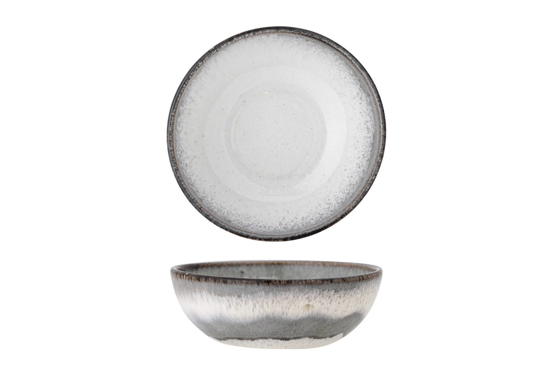 The bowl is crafted from high – quality ceramic, either porcelain or stoneware clay, and fired in a kiln for durability. It features a glossy, semi – translucent glaze with natural color variations, achieved through techniques like raku or crystalline glazing. The colors are dominated by cool grays and whites, with a gradient from light near – white at the base and interior to darker gray/charcoal at the rim. The glaze also has subtle, natural texture variations such as speckling and marbling, adding to its artisanal allure.