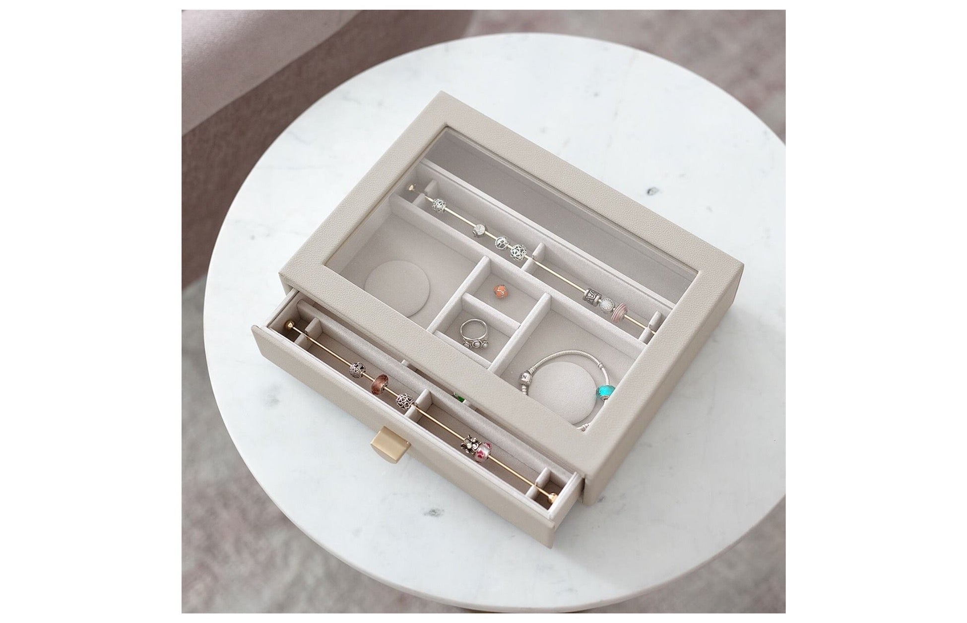 This jewelry organizer box is a perfect solution for keeping your jewelry collection organized and on display. It offers a stylish and practical way to various types of jewelry, making it easy to find what you need.