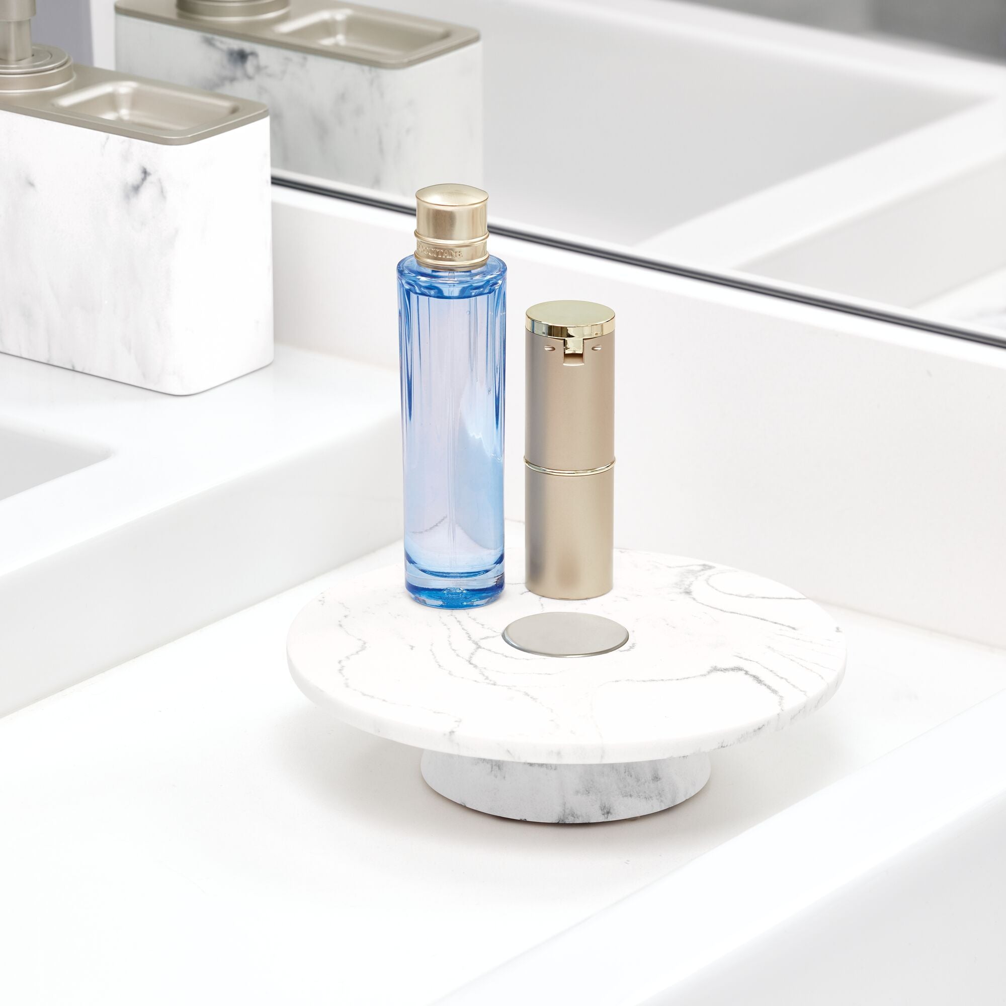 Designed by iDesign, a well – known company specializing in home organization solutions, this tray is crafted with high – quality materials. The primary surface is made of a marble – effect material, likely resin or a composite mimicking natural marble, with beautiful gray veining. It gives the tray a sleek and sophisticated appearance, similar to natural Carrara marble. The central element is a metallic circle, probably stainless steel or chrome, which not only adds a silver/chrome accent but also serves a functional purpose as it is magnetic, perfect for holding small metal items such as watches, rings, or jewelry with metal components.