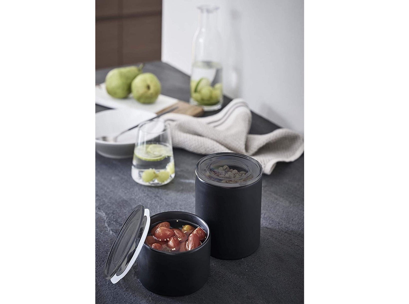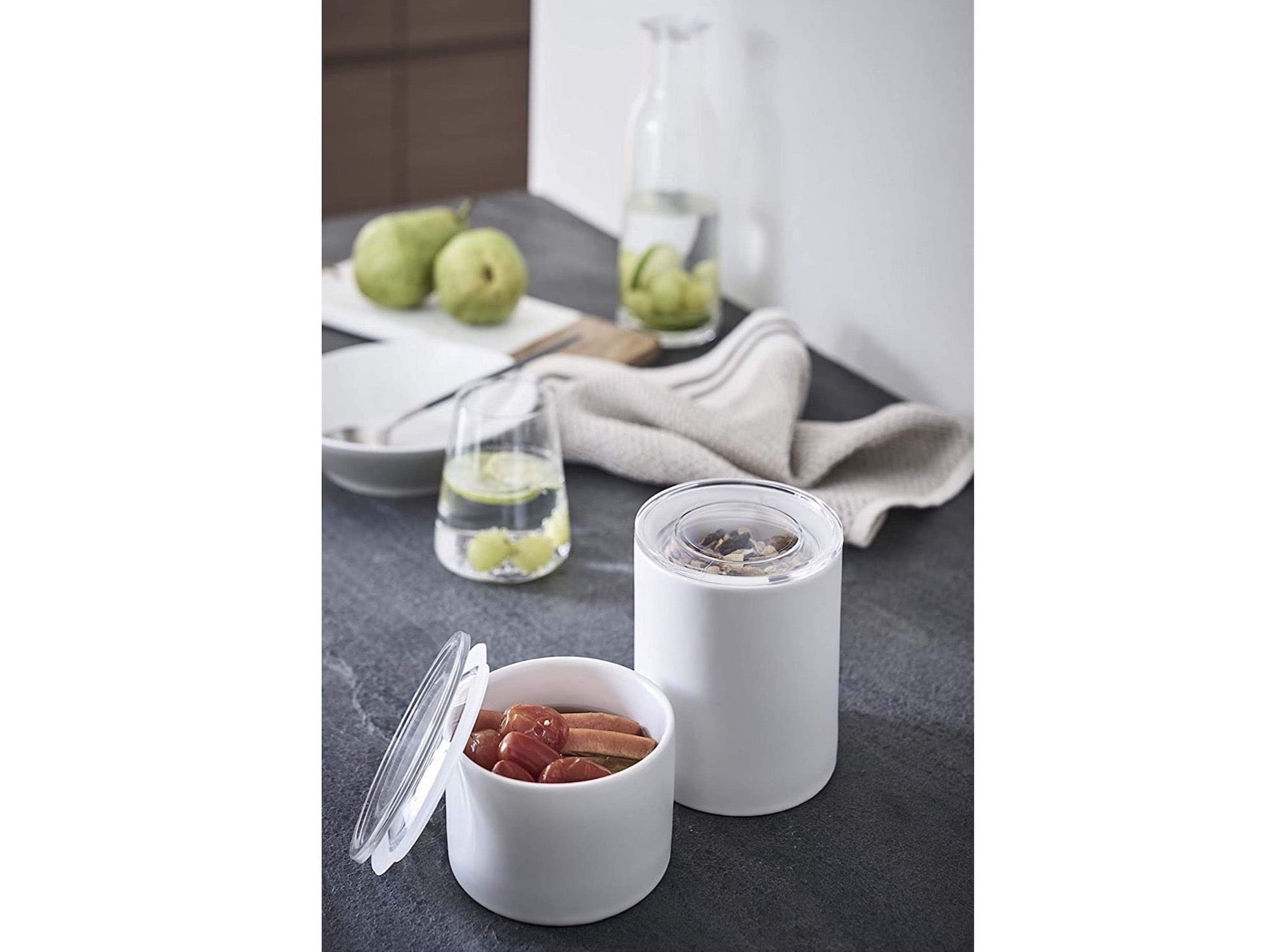 - Design: Cylindrical shape with clean, minimalist lines, clear lid with a curved, seamless edge and a nested design for secure closure