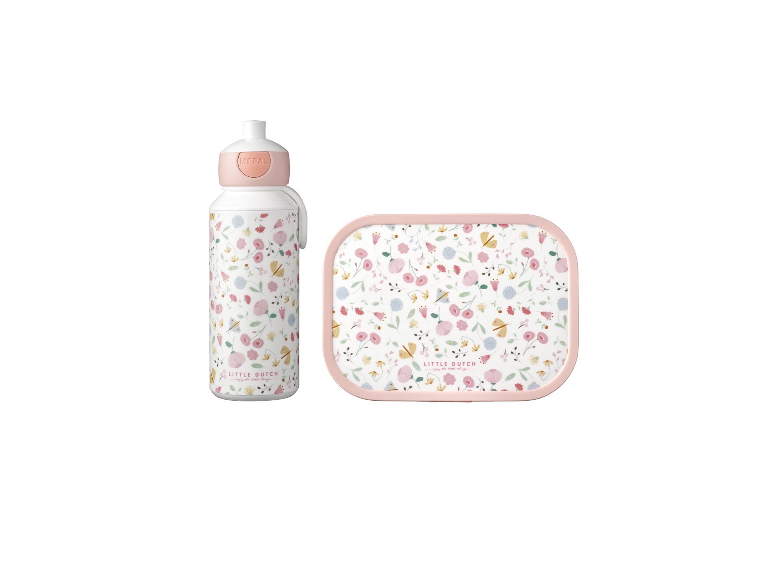 Introducing the Trinkflasche Pop-up Campus Little Dutch – Flowers & Butterflies, a delightful and practical set for kids. This coordinated set includes a reusable water bottle from Mepal and a small rectangular food container, both featuring an enchanting floral design.