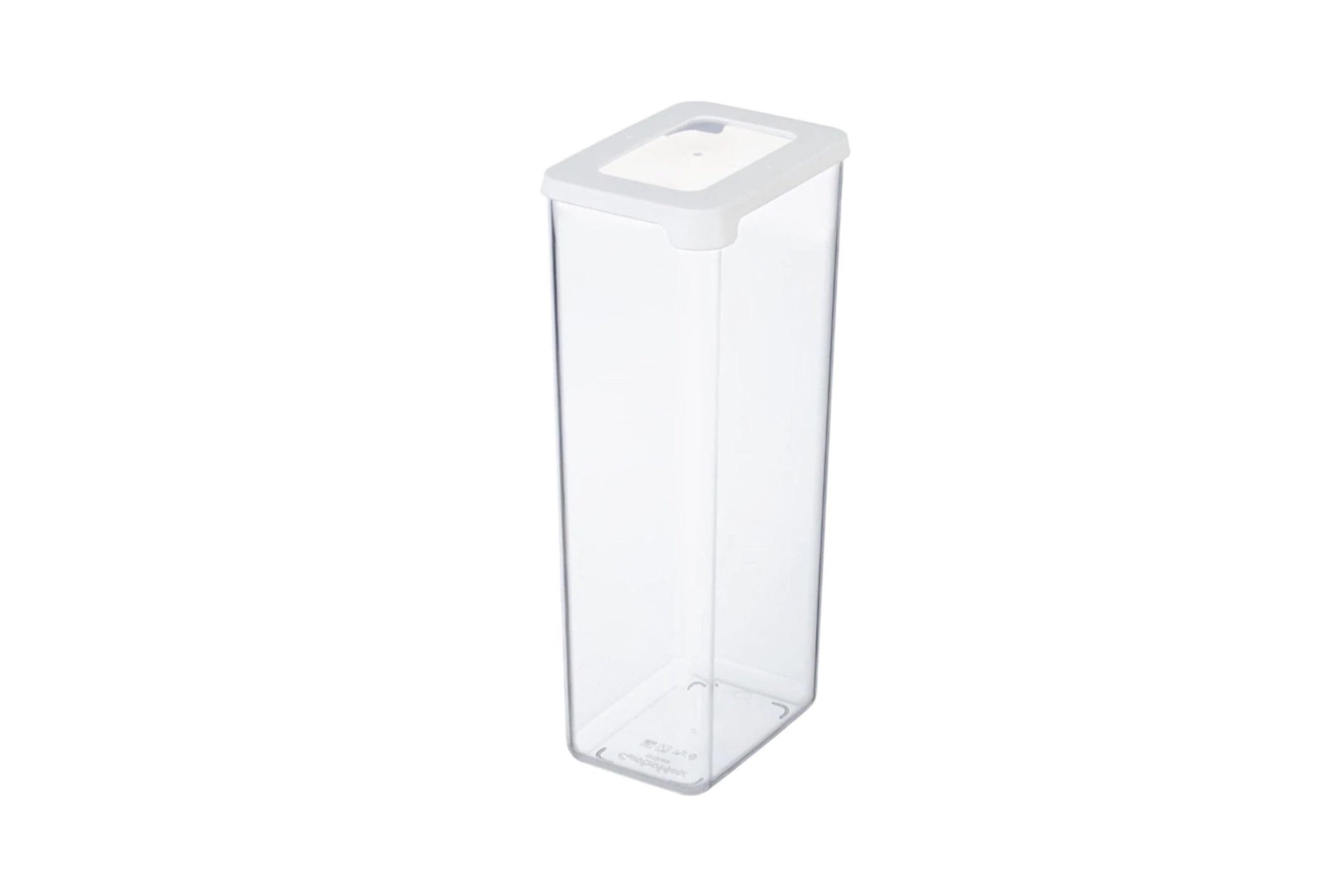 With a clean, rectangular shape and a tall, narrow profile, this large container is perfect for long items like spaghetti. Its minimalist, modern aesthetic with smooth, seamless lines adds a tidy look to your kitchen. The lids feature a rectangular top with a small opening/handle for easy lifting, and there’s a circular label area on the side of the container, allowing you to clearly mark the contents.