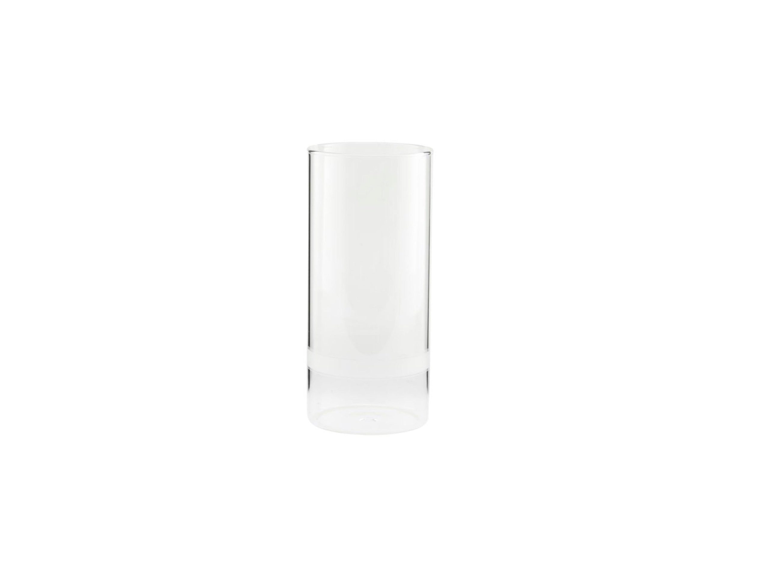 The minimalist design features a flat, even base and smooth, straight sides with a subtle, thin ring or band near the bottom, adding a touch of functionality or decoration. Its clear color and sleek, modern aesthetic make it a perfect fit for any home, office, or art studio setting.